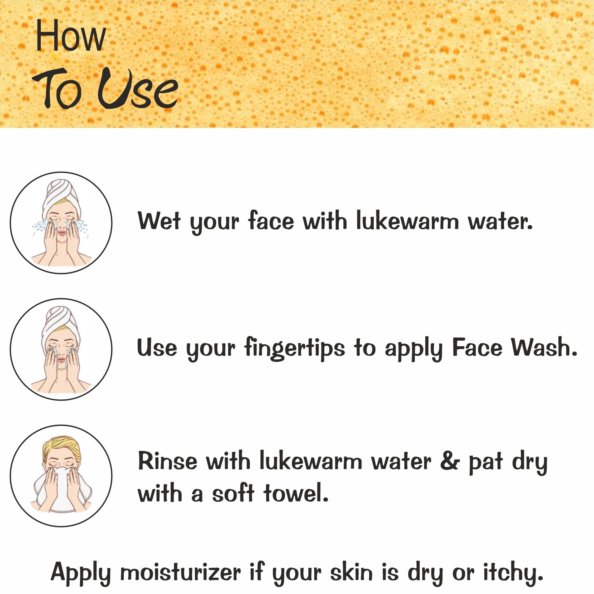 How to Use: Apply a small amount of face wash to your face and neck, Use your fingers to rub the face wash onto your skin, Gently massage your face and neck in small circular motions, Rinse thoroughly