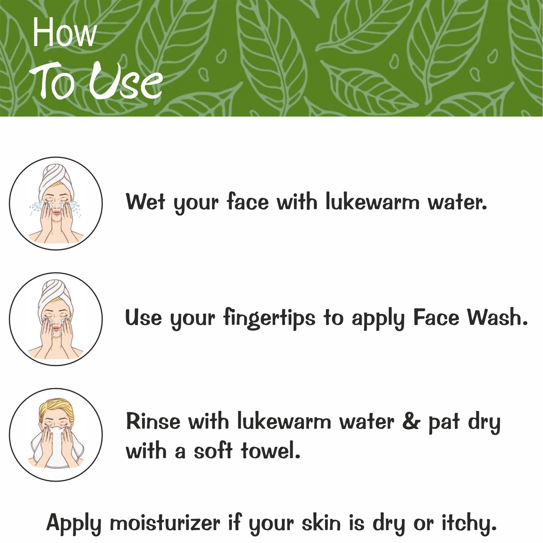 How to Use: Apply a small amount of face wash to your face and neck, Use your fingers to rub the face wash onto your skin, Gently massage your face and neck in small circular motions, Rinse thoroughly